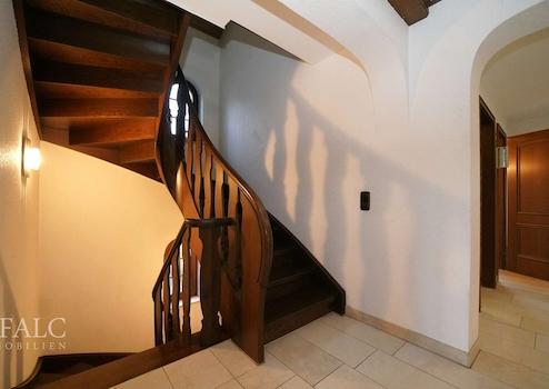 Schon beim Betreten des Hauses spürt man den besonderen Charme dieser Villa: Durch die Hangposition erreicht man das Erdgeschoss über eine breite Außentreppe, die elegant zum Eingang führt. Sobald Sie die Tür öffnen, gelangen Sie in eine offene Diele, die den Blick direkt in mehrere Bereiche des Hauses lenkt.