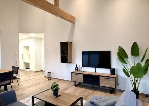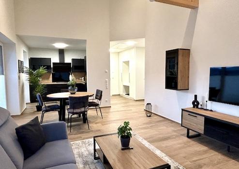 Wohn- Esszimmer: Sitzecke mit Couch, großer Essbereich, TV, Soundsystem