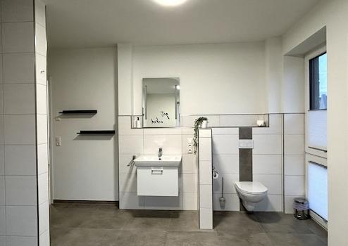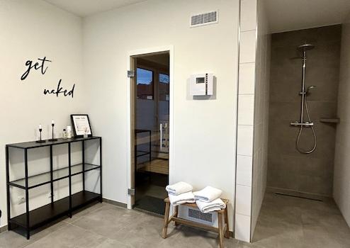 Bad und Sanitär: bodentiefe, barrierefreie Dusche, Waschtisch mit Spiegel, WC, Handtuchheizung, Sauna inkl. Saunaausstattung