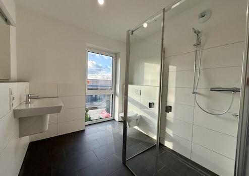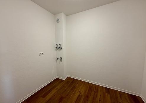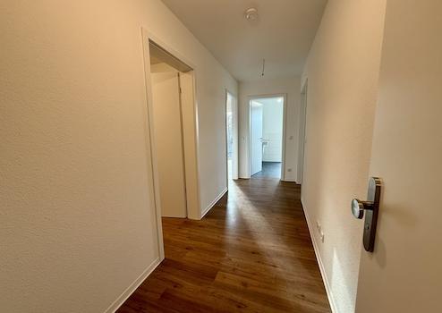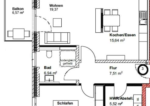 Der Flur dient als Verbindung zu allen Wohnräumen. Zunächst ist der Hauswirtschaftsraum zu erreichen. Hier sind die entsprechenden Anschlüsse für eine Waschmaschine, sowie für einen Trockner gegeben. Das Schlafzimmer bietet aufgrund der bodentiefen Fenster und der vorteilhaften Aufteilung ausreichend Platz zum Entspannen. Das Tageslicht-Bad verfügt über eine ebenerdige Dusche. Die lichtdurchflutete Wohnküche unterteilt sich in einen offenen Küchenbereich inkl. neuer Einbauküche, einen angrenzenden Essbereich, sowie einen gemütlichen Wohnbereich. Von hier aus gelangen Sie direkt auf den Balkon.