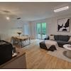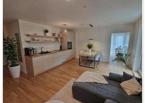 Der großzügige Wohnbereich mit integrierter, offener Küchenzeile bildet das Herzstück der Wohnung. Die große Fensterfront mit bodentiefen Elementen sorgt für reichlich Tageslicht und eine helle, freundliche Atmosphäre. Vom Wohnzimmer sowie vom Schlafzimmer aus gelangt man direkt auf die Süd- und Ostterrasse – ein idealer Rückzugsort für entspannte Stunden im Freien.