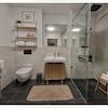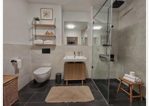 Das Badezimmer hat eine exklusive Sanitärausstattung (z.B. große Walk-in-Dusche), in der nebenan liegenden Kammer/Hauswirtschaftsraum haben Waschmaschine und Trockner ihren Platz.