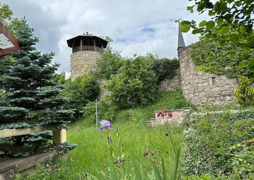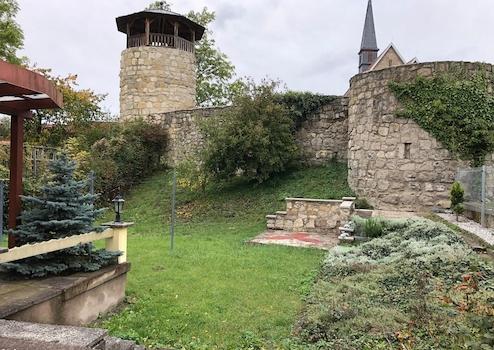 Wunderschöner Garten mit Terrasse und Blick auf historische Stadtmauer.