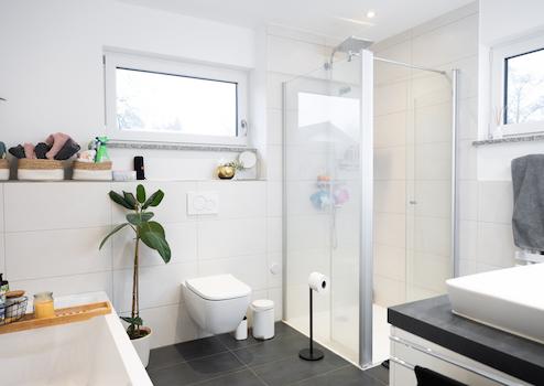 - ein Badezimmer im Obergeschoss mit Doppelwaschtisch, Badewanne und Dusche
