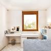 Zurück in der Wohnung führt der Weg ins Schlafzimmer. Der Raum wirkt ruhig und gut möblierbar, mit Platz für Bett und zusätzliche Möbel. Ein separater Bereich mit großen Holz-Lamellentüren ist als Ankleide nutzbar und sorgt für ordentliches Verstauen.