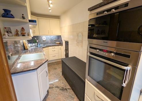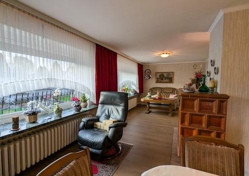 Herzstück der Wohnebene ist der großzügige Wohnbereich mit angrenzendem Wintergarten und Kachelofen. Große Fensterflächen sorgen für viel Tageslicht und schaffen eine angenehme Wohnatmosphäre zu jeder Jahreszeit. Von hier aus gelangen Sie auf die weitläufige Dachterrasse, die ideale Voraussetzungen für entspannte Stunden im Freien bietet – mit freiem Blick in die Natur. Die Immobilie präsentiert sich insgesamt in einem gepflegten Zustand, die Ausstattung entspricht jedoch dem Baujahr und bietet somit Potenzial für individuelle Modernisierungsmaßnahmen.