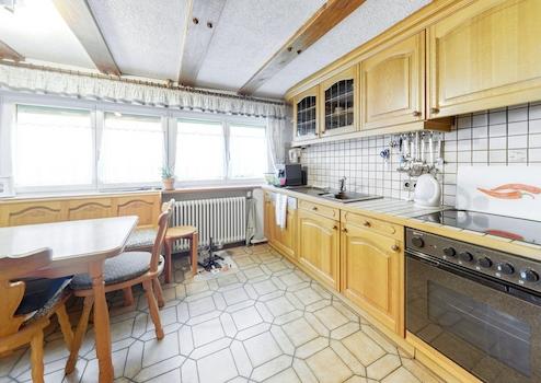 Die einfache Ausstattungsqualität des Hauses bietet eine hervorragende Basis für individuelle Renovierungsarbeiten und Ausbau zu einem Zwei- oder Dreifamilienhaus. Die Bodenbeläge bestehen aus einer Mischung von älteren Teppichen, Parkett und Steinböden, die dem Haus seinen Charakter verleihen. Eine Einbauküche aus den 1980ern ist bereits vorhanden, sodass Sie direkt mit dem Kochen loslegen können.