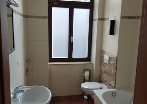 Die Sanitärobjekte sind weiß. Das Bad ist mit Wand-und Bodenfliesen ausgerüstet die mit Naturstein verarbeitet wurden.