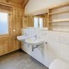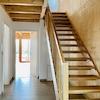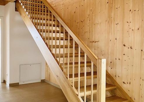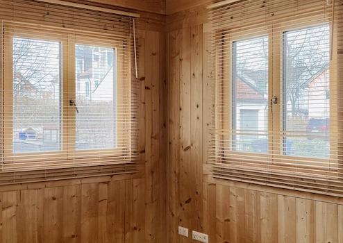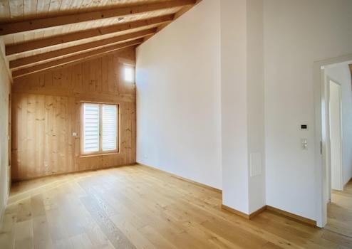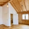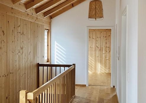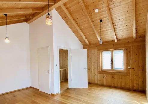 Das Obergeschoss hat in allen 3 Räumen hohe Decken mit Holzbalkendecke, zwei davon haben bei gutem Wetter Blick auf das Alpenpanorama. Hier befindet sich auch ein großes Badezimmer mit Badewanne und Dusche.