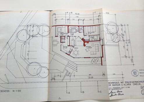 Das Haus wurde 1982 für ein Ärzteehepaar geplant und entsprechend großzügig und klar strukturiert ausgeführt. Bereits der Eingangsbereich mit der eleganten Marmortreppe vermittelt den ersten Eindruck des besonderen Raumgefühls, das sich durch das gesamte Haus zieht.
