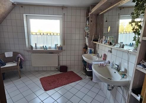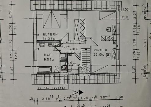 Im Obergeschoss liegen die beiden Kinderzimmer. Geplant als ein Raum, mit Trockenbauwand voneinander getrennt. Sowie das Elternschlafzimmer, das große Bad mit Fußbodenheizung sowie der Heizungsraum. Zugang zum Dachboden ist über eine einklappbare Dachleiter.