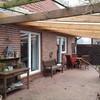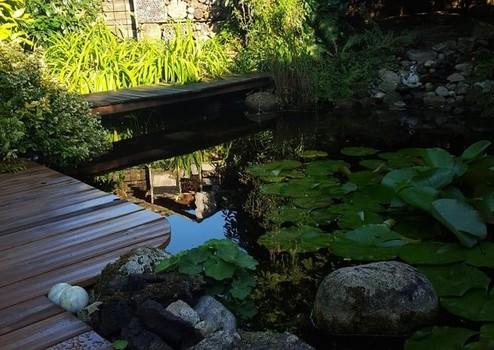 Im Außenbereich ist direkt angeschlossen an die Küche und das Wohnzimmer die Terasse mit Doppelstegplatten. Diese lädt zum sitzen am Teich ein.