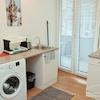 Offene Einbauküche, komplett ausgestattet mit 2-Platten- Herd, Mikrowelle, Kühlschrank, Waschmaschine, Zugang zum