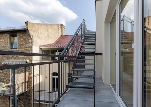 Das Highlight der Wohnung ist die weitläufige Dachterrasse, die einen unvergleichlichen Blick über die Dächer der Stadt bietet und zum Entspannen, Sonnenbaden oder geselligen Abenden mit Freunden einlädt. Große Fensterfronten sorgen für ein helles, freundliches Ambiente und schaffen nahtlose Übergänge zwischen Innen- und Außenbereich.