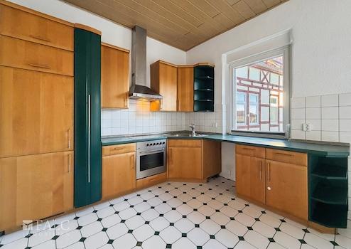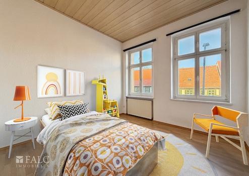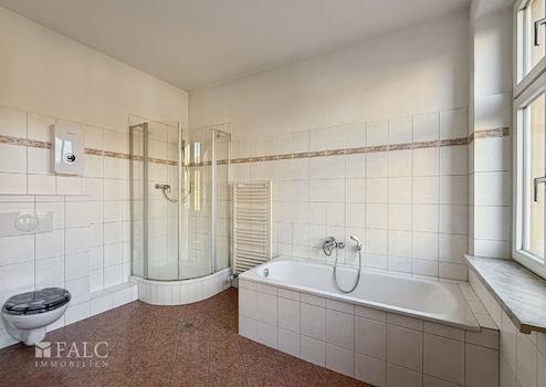 Auf der gegenüberliegenden Seite befindet sich eine ca. 111 m² große 4-Raum-Maisonettewohnung. Sie bietet unter anderem ein geräumiges, helles Badezimmer mit Dusche und Badewanne sowie ein ca. 30 m² großes, lichtdurchflutetes Wohnzimmer. Diese Einheit wurde im Jahr 2000 saniert und eignet sich hervorragend für Familien oder Paare mit Platzbedarf.
