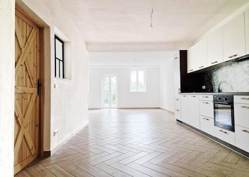 Rechter Hand schließt eine offene Küchenzeile an. Davor kann ein sehr langer Esstisch platziert werden, so dass gemeinschaftliches Kochen und Essen wirklich gemeinschaftlich ist. Alternativ bietet der an die Küchenzeile anschließende 30 qm große Wohnbereich neben einer Wohnlandschaft genügend Platz für einen großen Esstisch, den Elefanten oder das Klavier.