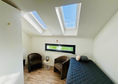 Dieses nicht alltägliche, 2009 erbaute Einfamilienhaus befindet sich in ruhiger Lage im beliebten Gütersloher Ortsteil Isselhorst. Die Immobilie überzeugt schon beim Betreten mit seinen auf 161,57 m² Wohnfläche verteiltem, offenem Raumkonzept. Das moderne, in massiver Bauweise errichtete, 1 1/2 geschossene Architektenhaus ist komplett (inkl. Keller) mit Fußbodenheizung ausgestattet. Durch den Flur, vorbei an einem geschmackvollen Gäste-WC mit ebenerdiger Dusche, gelangt man in den äußerst großzügigen und hellen Wohnbereich, aus dem man durch bodentiefe Fenster auf eine der beiden Terrassen und in den wunderschönen Garten blickt. An den offenen Essbereich schließt sich die, vom Tischler angefertigte, hochwertige Küche an, die komplett mit Miele-Geräten, unter anderem einem Dampfgarer, einem Kaffeevollautomaten, Wärmeschublade und einem Weinkühlschrank ausgestattet ist. Direkt aus der Küche tritt man auf die zweite sonnige Frühstücksterrasse, auf der sowohl die ganze Familie, als auch Gäste Platz finden. Eine breite Treppe führt in das Obergeschoss, in dem man von einer offenen Galerie mit Lese-Ecke empfangen wird. Hier befindet sich auch ein abgetrennter Bereich mit einem hellen Schlafzimmer und eigenem Bad, ausgestattet mit Badewanne, ebenerdiger Dusche und Waschtisch; angrenzend ein eigener Raum für das WC. Außerdem befinden sich im Obergeschoss zwei Kinder-bzw. Gästezimmer, die durch ein - von beiden Räumen begehbares - Duschbad mit Waschbecken und WC verbunden sind.