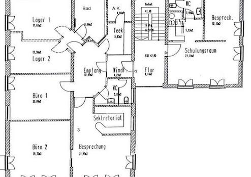 Im Erdgeschoss ist über den Windfang die Einheit 1 sowie auch die Doppelgarage, welche etwas größer als genehmigt errichtet wurde, erreichbar. Vom Empfang sind nahezu alle Büros aus erreichbar. Vom Sekretariat war über eine mobile Stellwand ein Besprechungszimmer mit Küchenzeile abgetrennt. Das Sekretariat und das Chefbüro haben Zugang zur sonnigen Südterrasse. Das Bad ist mit Wanne, Waschbecken, Bidet und WC ausgestattet, ein weiteres WC ist vorhanden.