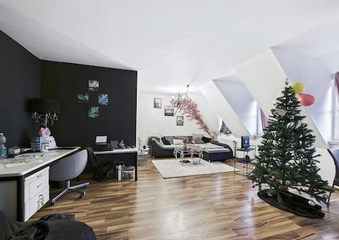 Herzstück der Wohnung ist das großzügige Wohnzimmer mit ca. 40 m², das vielfältige Einrichtungsmöglichkeiten für Wohnen, Essen und Arbeiten bietet. Große Fensterflächen sorgen für eine angenehme Lichtdurchflutung und ein freundliches Wohnambiente. Die Dachschrägen verleihen dem Raum zusätzlichen Charakter und Gemütlichkeit.