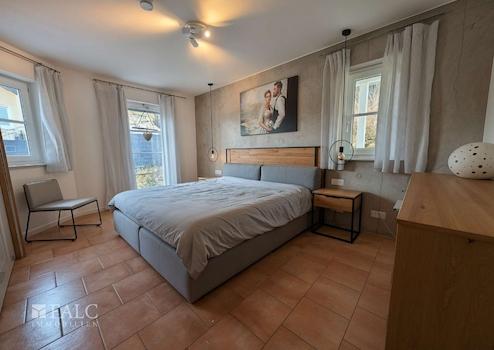 Zum Garten hin liegen das Elternschlafzimmer sowie zwei weitere Zimmer, die flexibel als Kinderzimmer, Gästezimmer oder als Homeoffice-Platz genutzt werden können. Das schöne Badezimmer mit barrierefreier Dusche und Eckbadewanne wurde 2023 vollständig renoviert und ist ein echtes Highlight - eine Wellnessoase zum Wohlfühlen. Ein separates Gäste-WC ergänzt die Ausstattung.