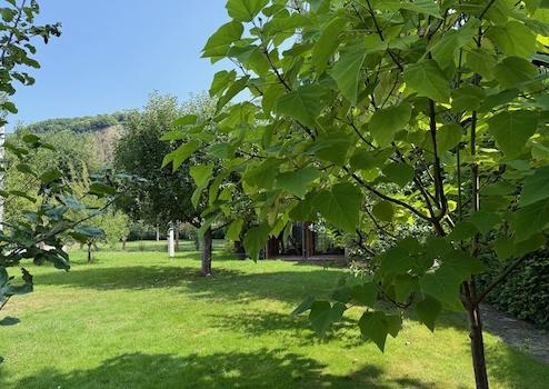 sehr schöner und großzügig angelegte Garten mit Obstbäumen und Holzunterstand.
