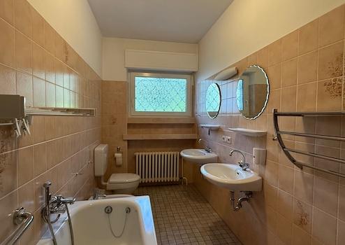 Vom Elternschlafzimmer gelangt man in das Badezimmer, welches mit einer Wanne und einer Dusche ausgestattet ist.
