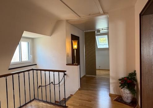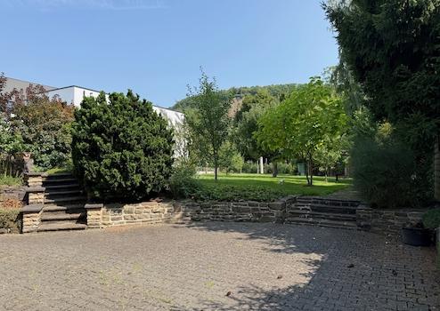 Seitlich befindet sich befindet sich eine Treppe, welche zur Sonnenterrasse führt und zu den Zugängen zum Hof und zur Einfahrt sowie direkt in den Garten.