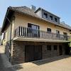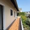 Man erhält Blick ins Grüne und zum Oberkasseler Steinbruch. Ein großer überdachter Balkon, teilweise beschattet durch eine Markise befindet sich auf der gesamten Breite des Hauses.