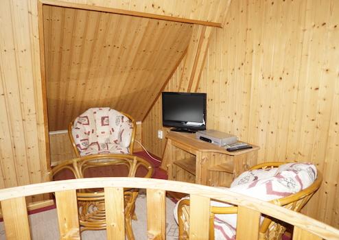 Über die Wendeltreppe ist das urige Dachgeschoss mit kompletter Holzverkleidung zu erreichen. Hier steht Ihnen der Schlafbereich und eine weitere Sitzecke mit TV-Anschluss zur Verfügung.