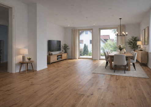 Links geht es in das Herzstück der Wohnung, in den grossen Wohn-Koch-Essbereich. Dieser hat einen Zugang zu dem grossen Südbalkon.