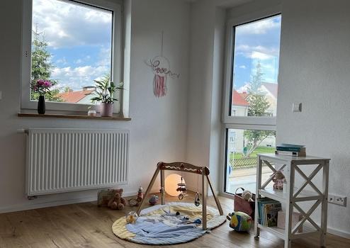 Beim Betreten der Wohnung fällt sofort der weitläufige Flur ins Auge, von dort geht es rechts in das moderne Bad und in eines der Kinderzimmer, welches auch gut als Büro benutzt werden kann.