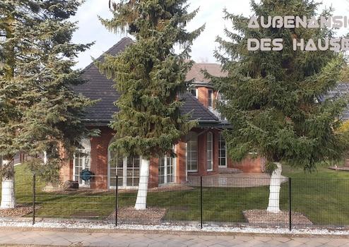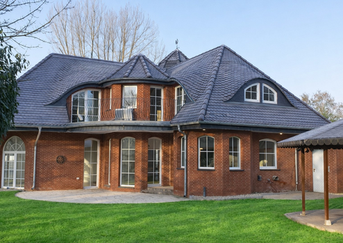 Diese charmante Landhausvilla wurde 1997 in solider Massivbauweise errichtet und überzeugt durch ihre außergewöhnliche Architektur mit Schwalbenschwanzdeckung, Fledermausgauben und dekorativen Türmen. Großzügige Raumhöhen, weitläufige Fensterflächen mit innenliegenden Sprossen sowie die repräsentative Gestaltung schaffen eine helle und zugleich elegante Wohnatmosphäre.