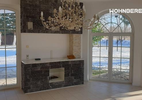 Über den einladenden Eingangsbereich gelangen Sie in den großzügigen Wohn- und Essbereich. Bodentiefe Fenster- und Türelemente sorgen hier für viel Tageslicht und einen direkten Bezug zum Garten. Ein optisches Highlight bildet die hochwertig gestaltete Wohnwand-/Designfläche in Natursteinoptik. Der Wohnbereich ist harmonisch gegliedert und bietet viel Stellfläche sowie flexible Einrichtungsmöglichkeiten.