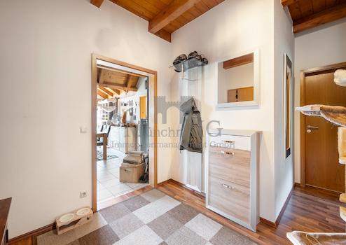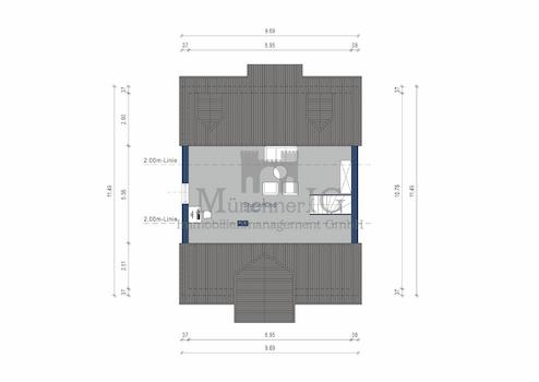 Über das freundliche Treppenhaus erreichen Sie ihr neues Domizil. Vom Eingangsbereich aus gelingen Sie in den Großzügigen Wohn- und Essbereich, der mit bodentiefen Fenstern im Eker sowie einem großen Dachfenster lichtdurchflutet zum Verweilen einlädt. Besonders eindrucksvoll ist die sichtbare Massivholzdecke, denn sie unterstreicht die unterschiedlichen Raumhöhen und vermittelt ein Chalet-Feeling. Darüber hinaus sorgt in kühlen Monaten der Kamin für Wohlfühlambiente. Zum attraktiven Wohnbereich gehört die separat gelegene Küche. Sie ist mit einer Bau Küche im modernen Landhausstil. Mit kassettierten Schranktüren ausgestattet. Ein Ceran-Kochfeld, die