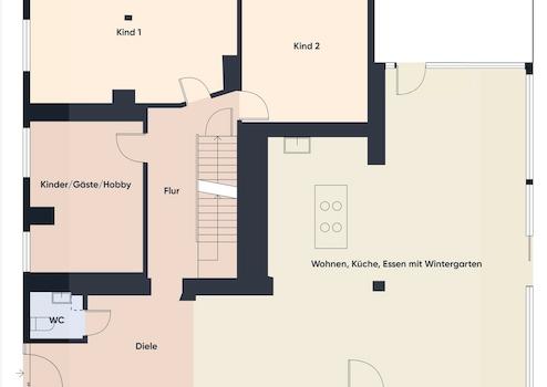 oErdgeschoss: 3 Kinder-, Gäste- oder Hobbyzimmer, offener Wohn-/Essbereich mit Wintergarten, Gäste-WC