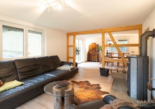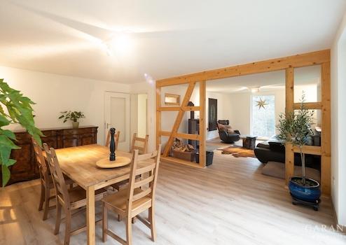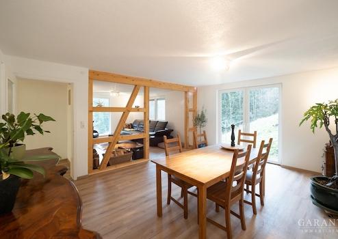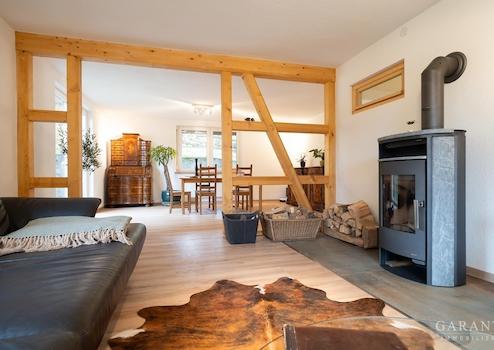 Aktuell wird das Erdgeschoss als Wohnbereich genutzt und begeistert durch teilweise freiliegendes Fachwerk sowie einen wunderschönen Ausblick.