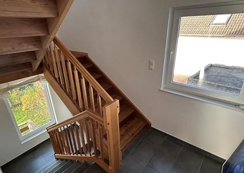 Im Obergeschoss des Hauses stehen Ihnen ein Schlafzimmer, zwei Kinderzimmer und ein Wannenbad zur Verfügung. Das Dachgeschoss wurde nachträglich ausgebaut, sowie um eine Gaube erweitert und bietet heute ein großzügiges Studio mit zusätzlichem Abstellraum, ideal als Arbeits-, Gäste- oder Jugendbereich. Ein echter Blickfang ist das Panoramafenster im Treppenraum, welches wie alle Fenster auf der Gartenseite einen schönen Ausblick über Reichelsheim und Ihren Garten bietet.