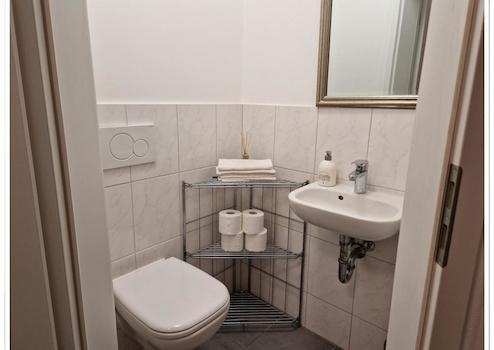 geschmackvoll ausgestattetes Bad und Gäste-WC; Vorbereitung für ein Bad mit Dusche im DG;