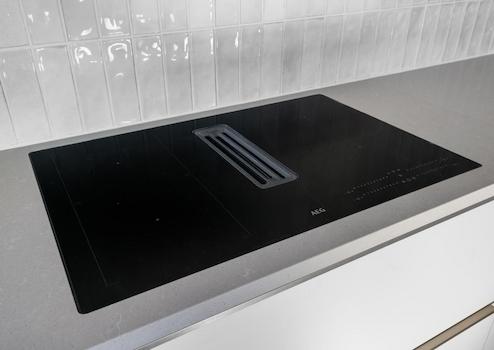 Küche: voll ausgestattet mit hochwertigen Geräten, robuste und pflegeleichte Fronten mit anti-fingerprint Beschichtung, Arbeitsplatte aus Stein.