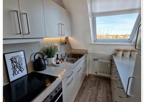 Die modern und gut ausgestattete Küche ist durch ein großes Dachliegefenster sehr hell und auch gut zu lüften. Die Anordnung der Küche mit 2 Zeilen bietet viel Stauraum und Bewegungsfreiheit.