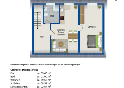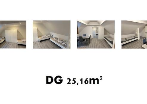 Dachgeschoss a 4 Betten: Flur, Bad, Wohnen, Schlafen, Schrägen antlg. = ca. 25,16 m²