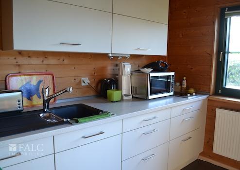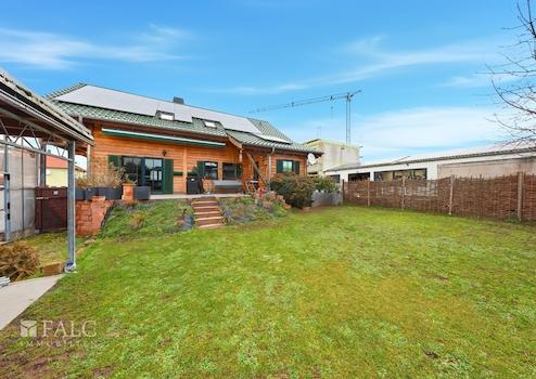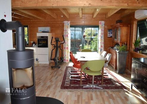 Das Wohnhaus überzeugt durch seine moderne Holzoptik-Fassade, grün lackierte Dachziegel sowie moderne, klappbare Kunststoffjalousien in grüner Farbe, die dem Objekt eine besondere und harmonische Optik verleihen.