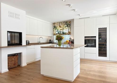 Im Erdgeschoss befindet sich ein großzügiger, offener Wohn- und Essbereich mit integrierter Küche, der durch einen Kamin mit Grillfunktion für gemütliche Stunden sorgt. Außerdem gibt es hier ein Schlafzimmer mit angrenzender Ankleide sowie ein modernes Badezimmer.