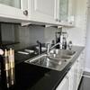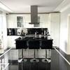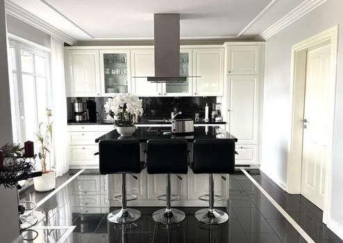 Der über 55qm große Wohn/ Essbereich lädt mit seinen 4 doppelflügeligen Terrassenfenster und Kaminofen, sowie einem offenen Kochbereich mit einer hochwertigen ALNO-Hochglanz-Einbauküche mit Kochinsel und Tresen zum entspannen ein. Die Arbeitsplatten, sowie die Rückwand und Kochinsel wurden ebenfalls mit einer Granitplatte (Galaxy)ausgestattet.