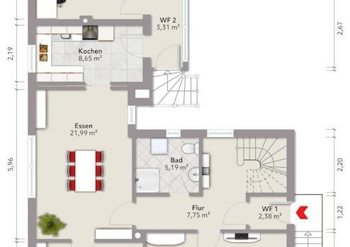 Das Erdgeschoss überzeugt durch einen großzügigen Wohnbereich, bestehend aus zwei miteinander verbundenen Räumen, die ein offenes und wohnliches Ambiente schaffen. Ergänzt wird diese Ebene durch ein geräumiges Esszimmer, eine Küche sowie ein Badezimmer. Im Anbau befindet sich ein Arbeitszimmer (Wasserschaden), das sowohl über einen separaten Flur/Windfang mit dem Haupthaus verbunden ist als auch über einen eigenen Zugang verfügt – ideal für Homeoffice, Gäste oder eine ruhige Rückzugsmöglichkeit.