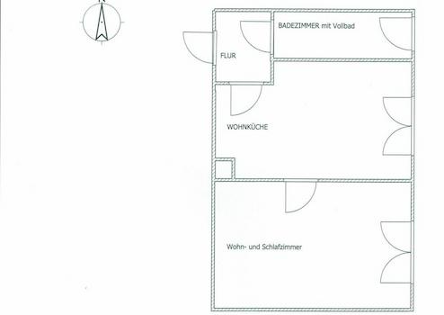 Zudem hat die Wohnung eine große Wohnküche, einen kleinen Flur und ein Wohn- und Schlafzimmer, welches von der Wohnküche abgeht und gut geschnitten ist (siehe Grundriss).