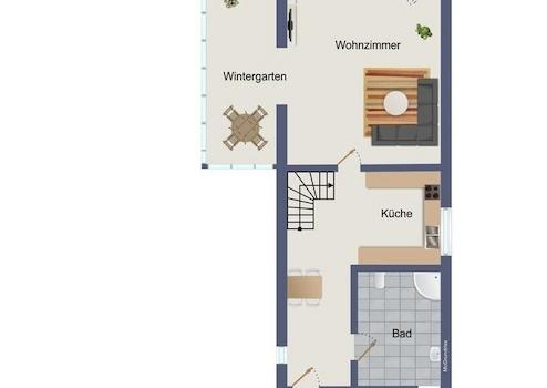 Die Hauptwohnung verfügt auf der mittleren Ebene über eine offene Küche, von der die Treppe ins Dachgeschoss führt, ein Ess-Wohnzimmer mit einem angrenzenden Wintergarten und ein modernisiertes Tageslichtbad mit Eckbadewanne.