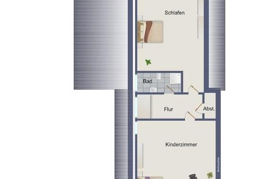 Im Dachgeschoss verfügt die Hauptwohnung über ein Schlafzimmer mit eingebautem sechs Meter langem Schlafzimmerschrank, ein Tageslichtbad mit Dusche und ein großes Kinderzimmer oder Arbeitszimmer.