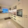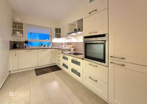 - halboffene Küche mit hochwertiger, heller Einbauküche in L-Form mit Premium Geräten, Fußbodenheizung