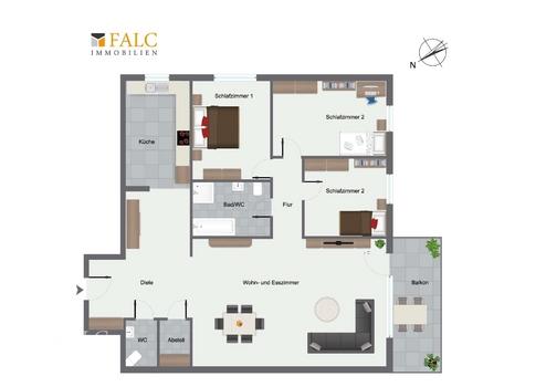 Wünschen Sie sich ein gemütliches Eck-Sofa und einen großen Esstisch? Im großzügigen Wohn-Essbereich gibt es gute Stellmöglichkeiten für Beides. Die große Fensterfront lässt den Raum hell wirken und bietet Zugang zum Balkon, der perfekt nach Süd-Westen ausgerichtet ist. Wer sich etwas mehr Schatten wünscht, wird sich an der Markise erfreuen. Vom Wohnbereich aus gelangen Sie über den kleinen Flur zu den drei Schlafräumen sowie dem Badezimmer, welches mit seinen freundlichen Farben und dem Komfort von Badewanne und Dusche überzeugt.